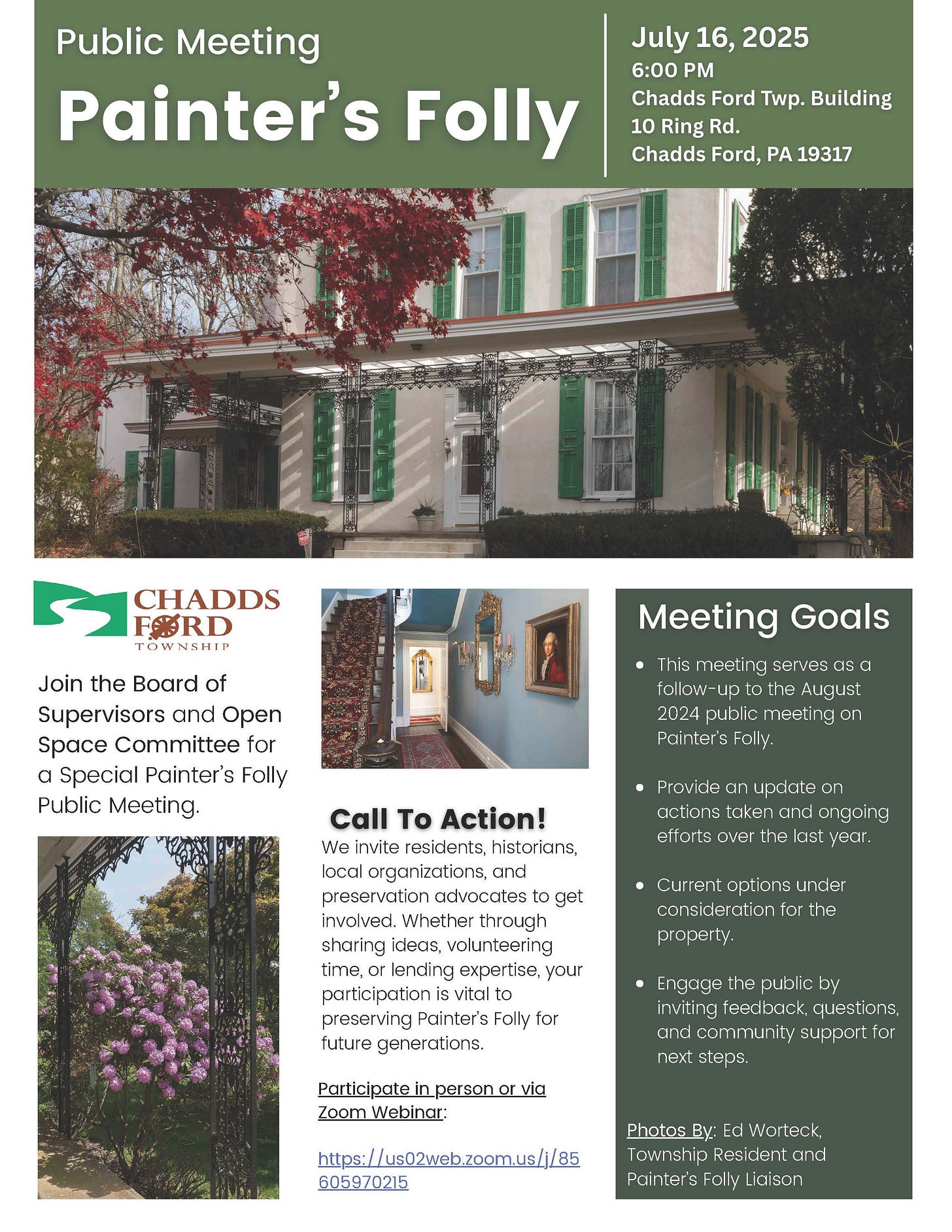 If you’re not able to attend, you can express your support via email or phone calls to the township to let them know you’d like to see more options explored before making a final decision on the fate of Painter’s Folly.