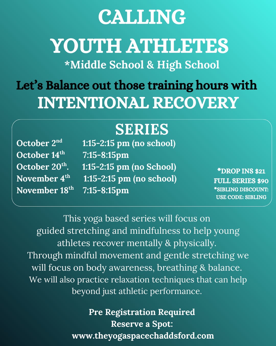 Got a young athlete who could use some stretching and “cool” yoga? You’re in luck. The Yoga Space is hosting a series of yoga classes for young athletes. Details below!
