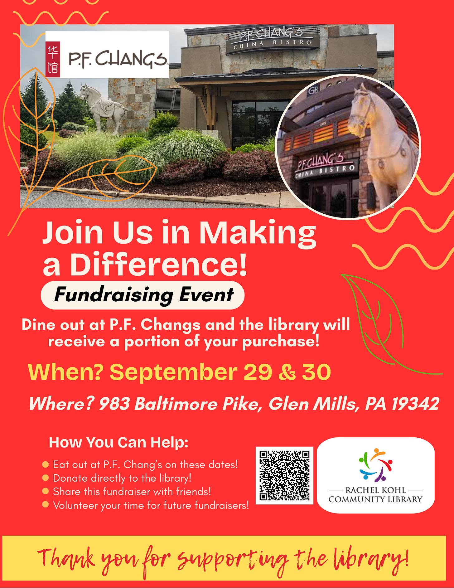 Skip dinner prep and let P.F. Chang’s make you dinner on September 29 or 30. They are hosting a Dine and Donate event to benefit the Rachel Kohl Library.